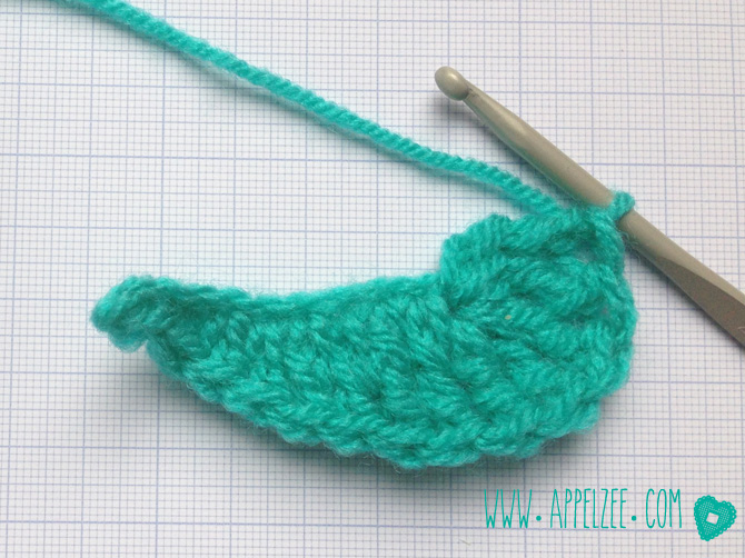 En haak vervolgens de andere helft van de druppel – in omgekeerde volgorde – weer naar boven toe: twee dubbele stokjes, twee stokjes, 3 vasten en sluit met een halve vaste. Klaar.