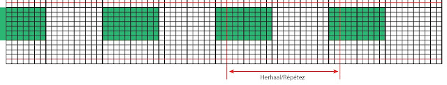 Haak 10 st in ecru, 8 st in groen, *haak 2 st in groen, haak 10 in ecru en 8 st in groen*. Herhaal wat tussen *…* staat nog 10 keer. Haak 2 st in groen en 10 in ecru.