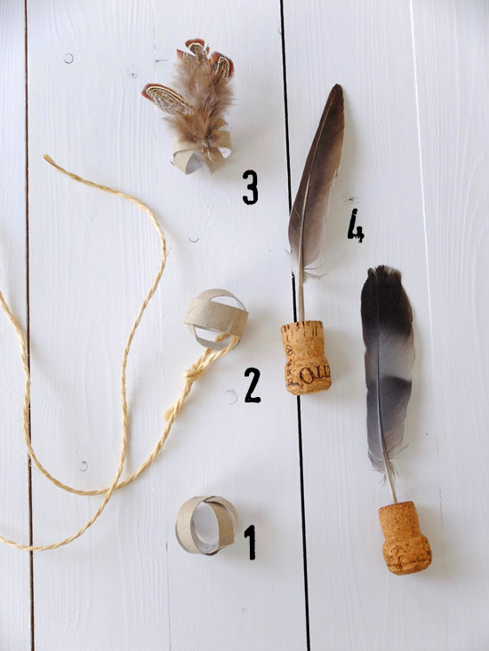 3- Het toiletpapierballetje 2.0, waarbij wat kleine pluimpjes die je samen met het karton vastniet, zorgen voor extra speelplezier.